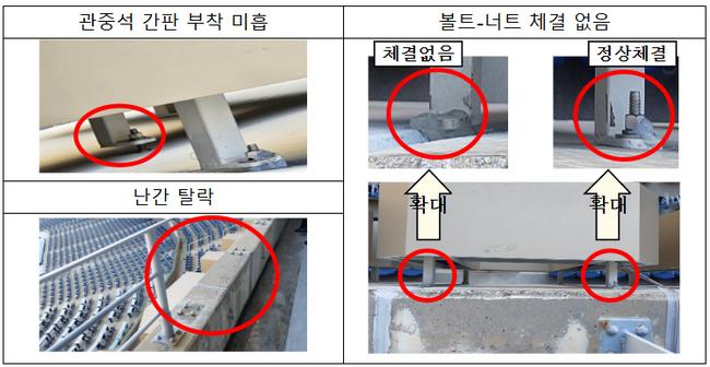 국토부는 창원시가 시행한 긴급안전점검 결과가 외관조사 미흡, 재료시험 조사위치 기준 미흡, 상태평가 표본단위 기준수량 미달, 가장 주요한 사용하중이 작용하는 관람석 철골구조 점검 미실시 등의 문제가 있었다고 지적했다.