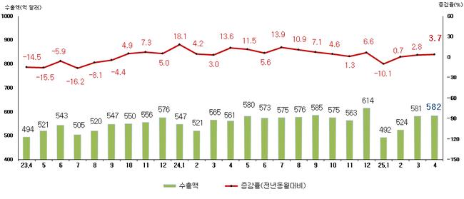산업통상자원부가 발표한 ‘2025년 4월 수출입 확정치’에 따르면, 수출은 전년 동월 대비 3.7% 증가한 582억 달러를 기록하며 3개월 연속 상승세를 이어갔다.