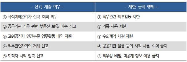 이해충돌방지법은 공직자의 공정한 직무수행을 보장하기 위해 공직자가 준수해야 하는 5가지의 신고 · 제출 의무와 5가지의 제한 · 금지 행위 기준 규정