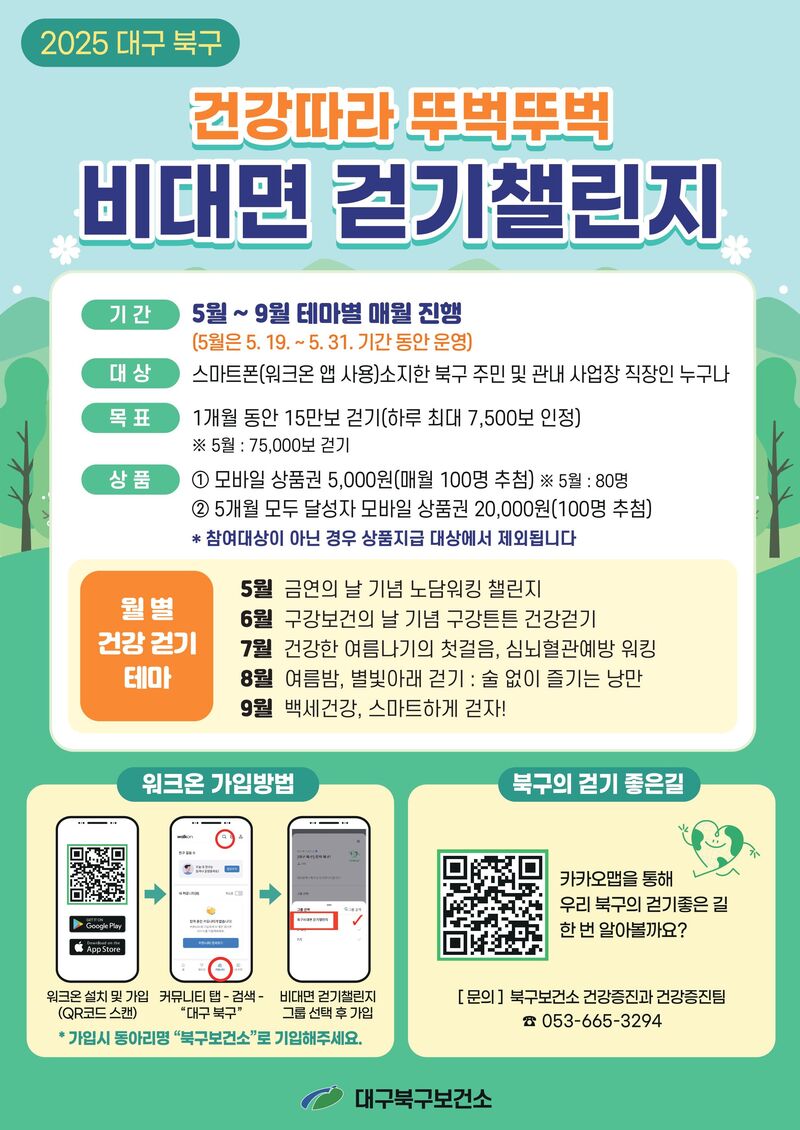 대구광역시 북구보건소는 지역주민의 건강증진을 위해 5월 19일부터 9월 말까지 모바일 앱을 활용한 비대면 걷기 챌린지를 운영한다.