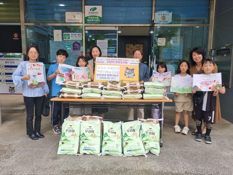 대구 북구 무태조야동 연경초등학교(교장 권은숙) 3학년 봉사동아리 행복나눔부에서 지난 16일(금) 무태조야동 행정복지센터(동장 최성옥)를 방문하여 함지산 산불피해 이웃을 위한 백미 10kg 25포를 기탁했다.
