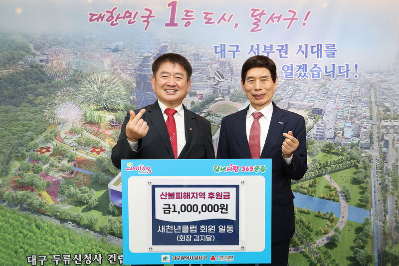 대구 달서구(구청장 이태훈)는 새천년클럽(회장 김지달)으로부터 산불 피해지역 지원을 위한 후원금 100만원을 기탁받았다고 21일 밝혔다.