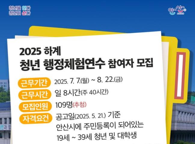안산시(시장 이민근)는 오는 28일부터 `2025년 하계 청년 행정체험연수` 참여자 109명을 모집한다고 23일 밝혔다.