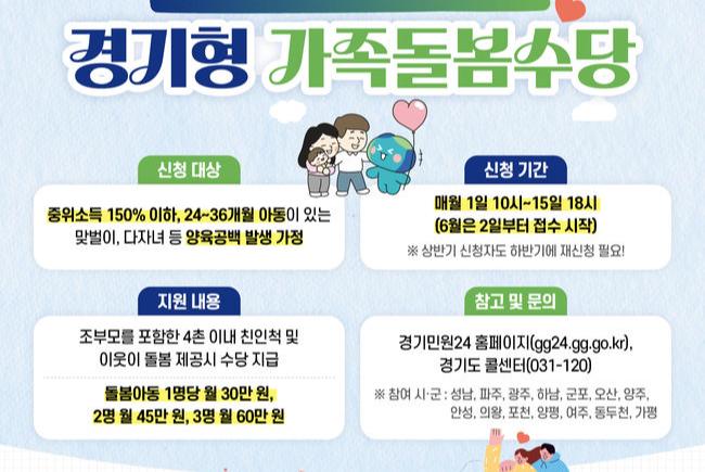경기형 가족돌봄수당은 중위소득 150% 이하, 24∼36개월 아동이 있는 양육공백 발생 가정에 조부모를 포함한 4촌 이내 친인척 및 이웃이 돌봄을 제공할 경우 수당을 지급해 자녀 양육부담을 경감하고 돌봄의 가치를 인정하는 사업이다.