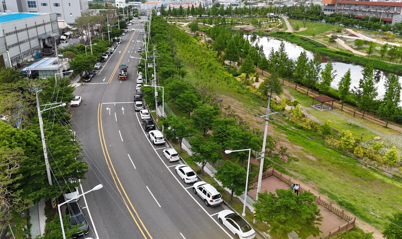성서5차산업단지 세천늪테마정원 인근 도로에 조성된 노상주차장 전경. 달성군 제공.