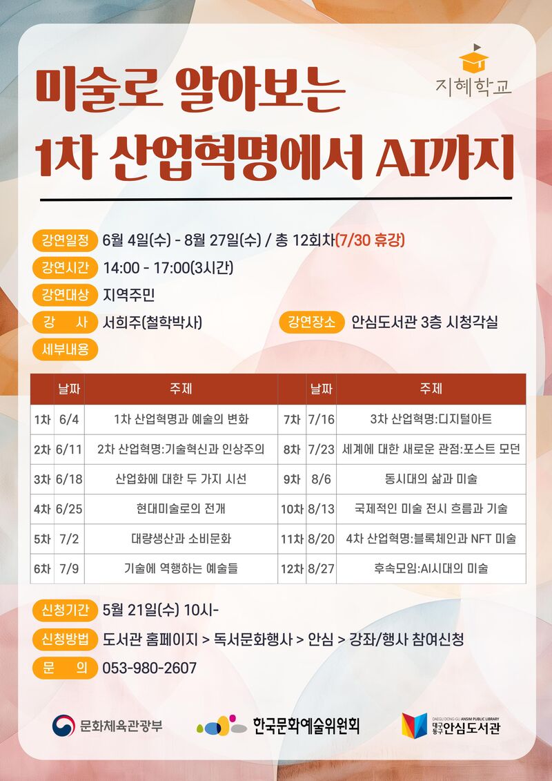 「지혜학교」사업은 인문 주제에 대한 깊이 있는 고찰로 삶의 지혜를 체득할 수 있는 대학 교양 수준의 심화 프로그램이다. 안심도서관에서 6월 4일부터 ‘미술로 알아보는 1차 산업혁명에서 AI까지’라는 주제로 진행되며, 신천도서관에서는 최근 대규모 산불이 남긴 엄청난 피해와 관련해 ‘기후 위기에 대한 인문학적 상상과 지혜’라는 주제로 7월 9일부터 운영된다.