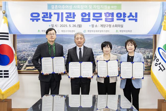 인천광역시 계양구(구청장 윤환)는 26일 계양여성새로일하기센터, 계양구가족센터, 계양여성회관과 함께 다문화여성의 사회참여 확대 및 자립 역량 강화를 위한 업무협약을 체결했다.
