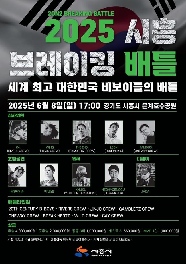 시흥시(시장 임병택)가 거리 문화의 대표 장르인 브레이킹(Breaking)의 향유 기회를 확대하기 위해 오는 6월 8일(일) 오후 5시 은계호수공원 일원에서 `2025 시흥 브레이킹 배틀`을 개최한다.