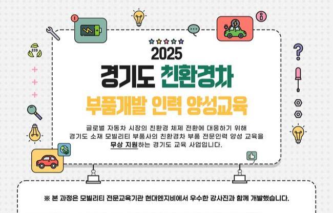 경기도, 친환경차 부품개발 인력 300명 양성 추진...6월 2일부터 접수 - 경기테크노파크 주관 교육 프로그램, 현대엔지비가 커리큘럼 개발 - 기본부터 심화까지 체계적 교육… 내연기관 부품업계 전환 지원 - 신청자 전원에 117차시 온라인 콘텐츠 제공