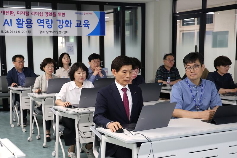 대구 달서구(구청장 이태훈)는 지난 28일, 29일 5급 이상 간부 공무원 40명을 대상으로 생성형 인공지능(AI) 실습 교육을 달서디지털창작센터에서 실시했다.