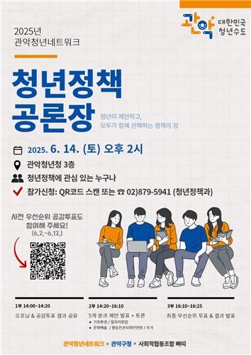 정책에 대한 온라인 사전투표 등 청년정책 공론장에 참여를 희망하는 주민은 포스터 내 QR코드를 통해 확인하거나, 관악구청 청년정책과(02-879-5941)로 문의하면 된다. 사전투표는 6월 2일부터 12일까지 10일간 진행된다.