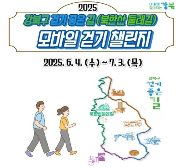 서울 강북구(구청장 이순희)는 구민들의 걷기 실천율 향상과 건강한 생활습관 형성을 위해 오는 6월 4일부터 7월 3일까지 한 달간 `모바일 걷기 챌린지`를 진행한다.