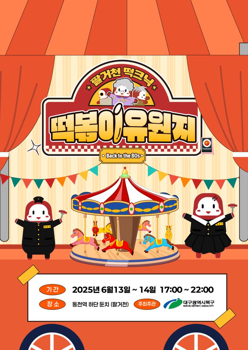 대구 북구청(청장 배광식)은 6월 13일(금) ~ 14일(토) 17시부터 22시까지 이틀간 도시철도 3호선 동천역 하단 팔거천 둔치에서 2025 팔거천 떡크닉「떡볶이 유원지」행사를 개최한다.