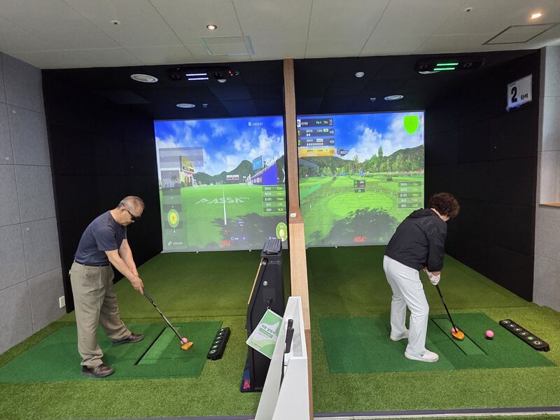 신설된 스크린 파크골프 시스템을 이용 중인 어르신. 화면에 집중하며 스윙을 준비하고 있다. 달성군 제공.