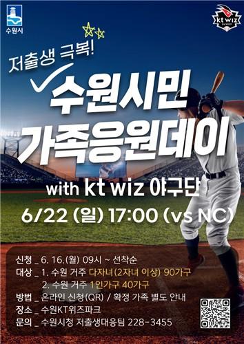 수원시가 22일 오후 수원kt위즈파크에 다자녀가구와 1인 가구를 초대하는 `수원시민 가족응원데이`를 연다.