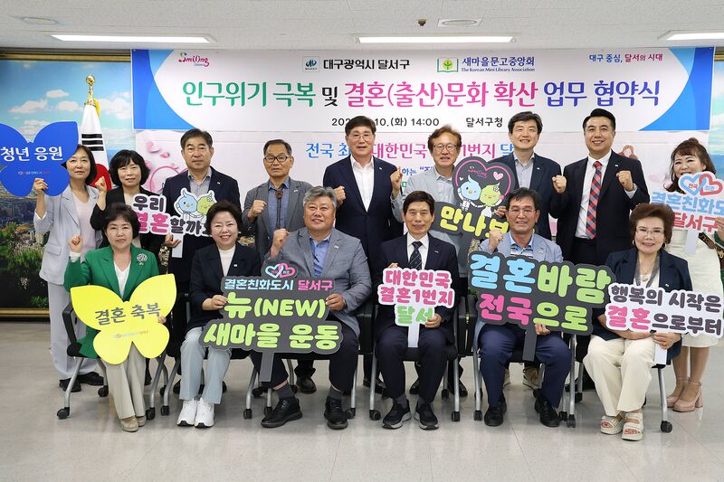 대구 달서구(구청장 이태훈)는 새마을문고중앙회(회장 김종철)와 초저출생에 따른 인구위기 극복과 결혼문화 확산을 위한 업무협약을 체결했다고 15일 밝혔다.