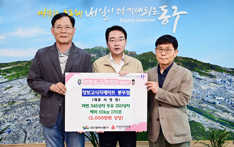 윤석준 동구청장은 “저소득 가정에 후원해 주신 장보고식자재마트 봉무점 서정권 대표에게 진심으로 감사드린다.”며 “기탁해 주신 물품은 도움이 필요한 분들께 소중히 전달하겠다.”고 했다.