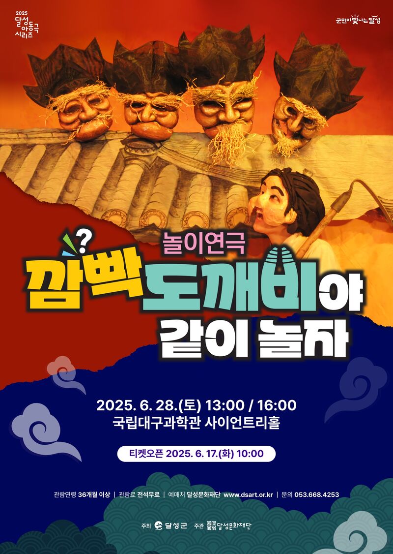 (재)달성문화재단(이사장 최재훈)은 ‘2025 달성 아동극 시리즈’의 두 번째 공연으로 ‘깜빡도깨비야 같이 놀자’를 오는 28일 국립대구과학관 사이언트리홀에서 오후 1시와 4시에 각각 개최한다고 밝혔다.