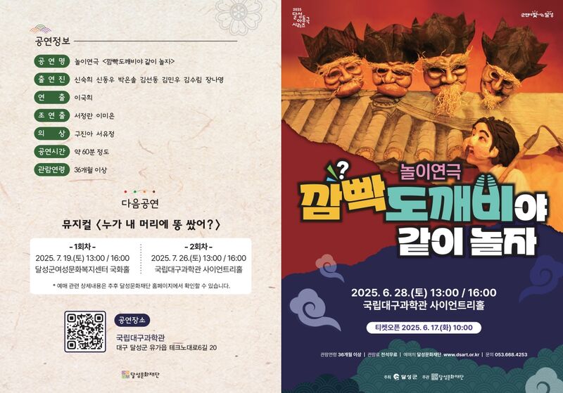 예매는 6월 17일 오전 10시부터 달성문화재단 홈페이지(www.dsart.or.kr)를 통해 가능하며, 전석 무료로 진행된다. 관람 가능 연령은 36개월 이상이며, 자세한 사항은 홈페이지 또는 대표전화(☎053-668-4253)를 통해 문의할 수 있다.