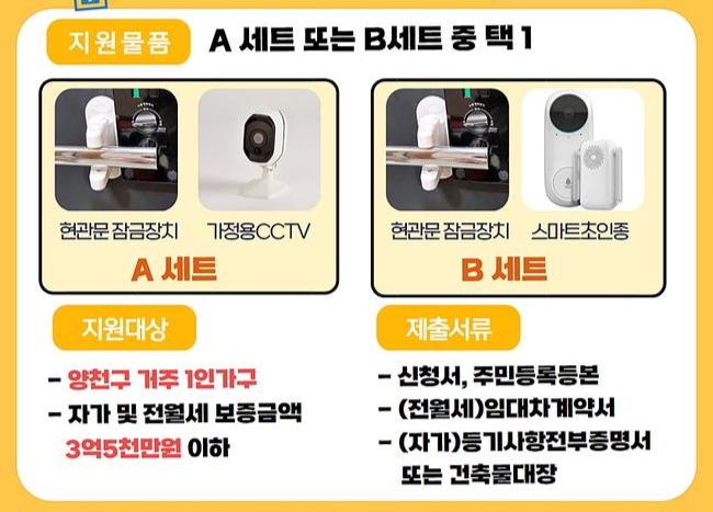 신청을 원하는 구민은 `안심홈세트`는 이달 30일까지, `긴급지원세트`와 `주거안전 취약계층 안심장비`는 7월 14일부터 9월 12일까지 목동종합사회복지관에 이메일로 제출하거나 방문 접수하면 된다. 신청자를 대상으로 선정 심의를 거쳐 최종결과를 개별 통보할 계획이다.