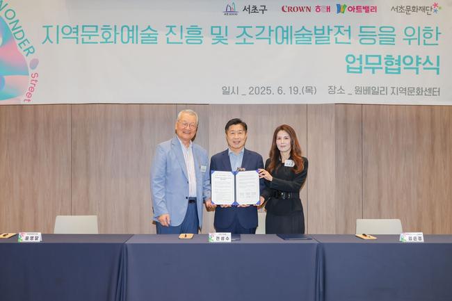 서울 서초구(구청장 전성수)는 19일(목), 지역 문화예술 진흥과 조각예술·공공미술 발전을 위해 크라운해태제과(회장 윤영달), 재단법인 서초문화재단(대표이사 강은경)과 업무협약(MOU)을 체결했다고 밝혔다.