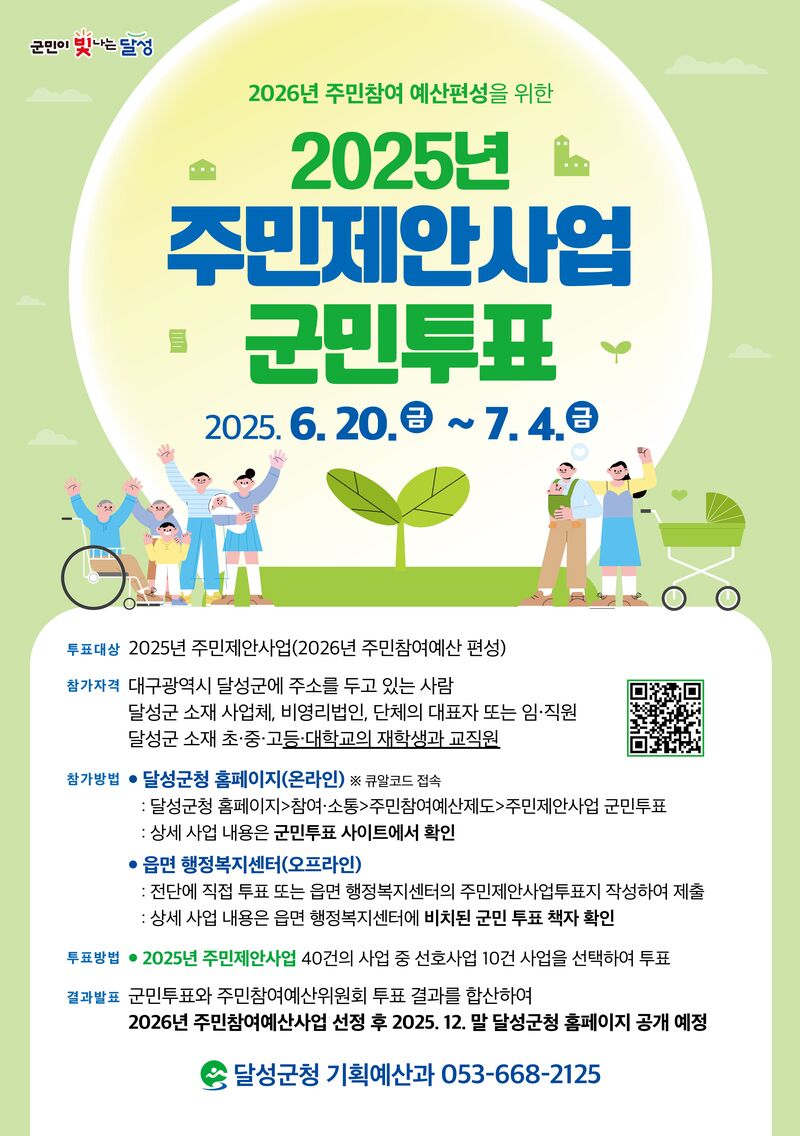 대구 달성군(군수 최재훈)은 6월 20일부터 7월 4일까지, 2025년도 주민참여예산사업 선정을 위한 군민투표를 실시한다고 밝혔다.