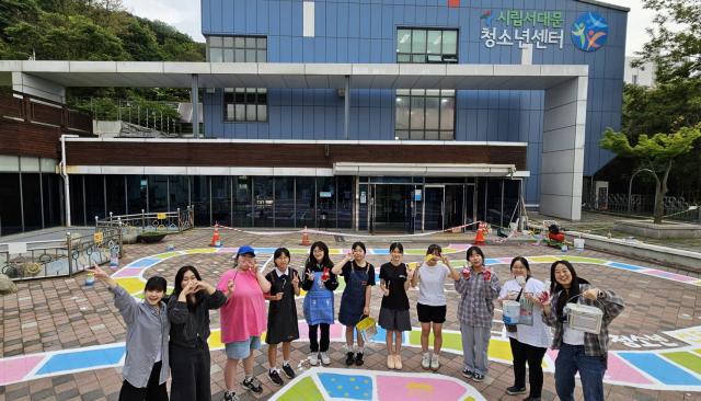 서대문청소년센터 청소년운영위원회 `꿀비`의 청소년 위원들이 센터 앞마당 바닥화 개선 작업을 완료한 후 기념사진을 촬영하고 있다