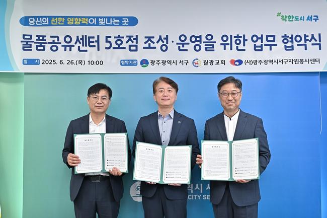 광주광역시 서구(구청장 김이강)가 26일 월광교회, ㈔광주광역시서구자원봉사센터와 `물품공유센터 5호점` 조성·운영을 위한 업무협약을 체결하고 민관 협력을 기반으로 생활 속 공유 문화 확산에 나선다.