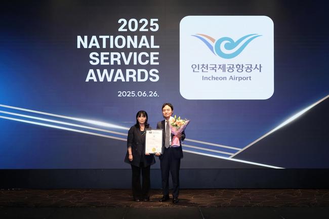 인천국제공항공사(사장 이학재)는 산업정책연구원 주관으로 26일 서울시 강남구 엘타워호텔에서 열린 `2025 국가서비스대상 시상식`에서 공항 환승 서비스 부문 대상을 수상했다고 27일 밝혔다.