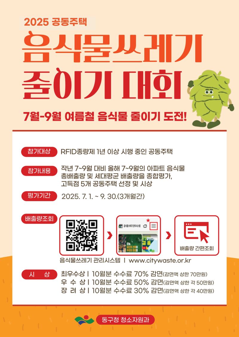 대구 동구청(구청장 윤석준)은 오는 7월 1일부터 9월 30일까지 ‘2025년 공동주택 음식물 쓰레기 줄이기 경진대회’를 개최한다.