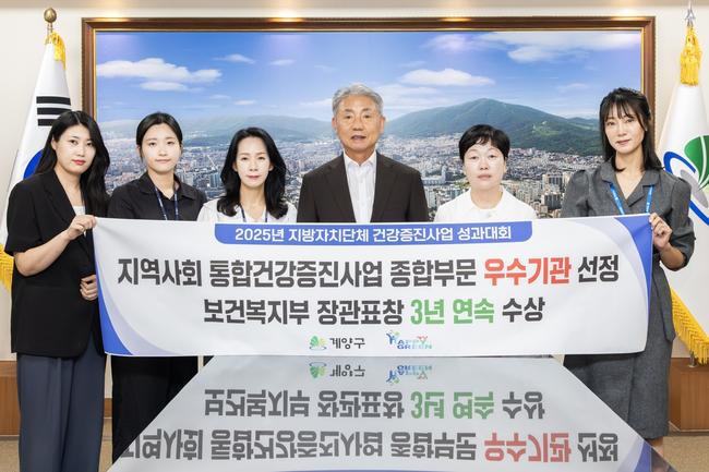 계양구는 2023년과 2024년 지역사회 통합건강증진사업 평가 종합부문 최우수기관 선정에 이어, 올해도 종합부문 우수기관으로 선정돼 `3년 연속` 보건복지부 장관상을 수상하는 성과를 냈다.