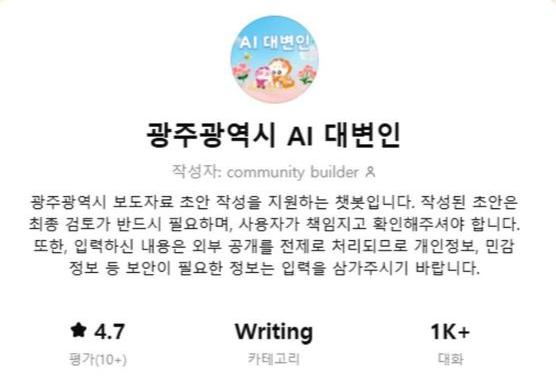 이 서비스는 보도자료 및 정책 설명문 초안 작성, 문서 요약 등 실무 전반에 활용, 공공홍보 품질 향상에도 크게 기여하고 있다는 평가를 받고 있다. 현재(7월1일 기준) AI 대변인은 1000명 이상이 사용하고 있으며, 사용자 평점은 5점 만점에 4.7점을 기록하며 높은 만족도를 보이고 있다.