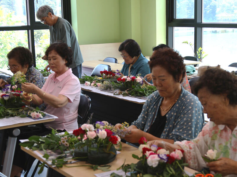 송해기념관 시니어 마음 놀이터 ‘예술 놀이’ 프로그램에 참여한 어르신들이 꽃수반 만들기에 열중하고 있다. 달성군 제공.