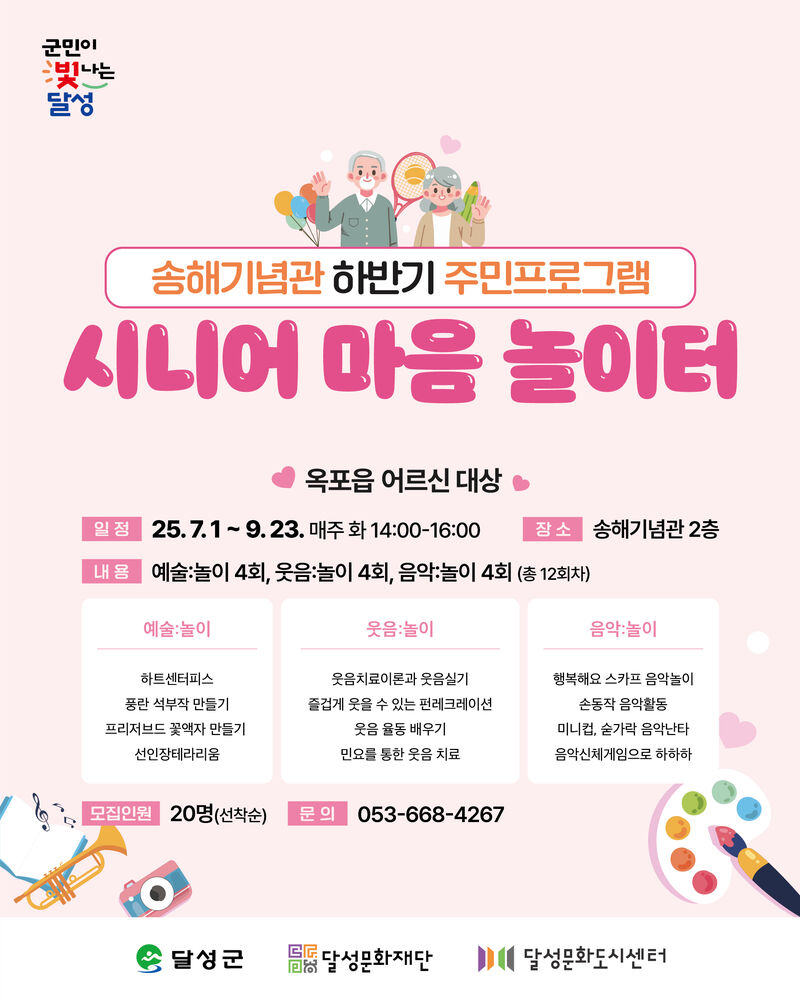 어르신 대상 프로그램 ‘시니어 마음 놀이터’도 기대를 모으고 있다. 매주 화요일 열리며, 예술놀이·웃음놀이·음악놀이(각 4회)로 구성됐다. 프로그램은 웃음과 예술을 매개로 어르신들의 심리적 안정과 사회적 교류를 돕는 데 중점을 두고 있다.