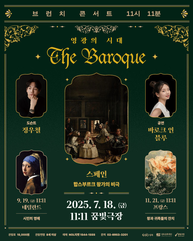 성북구 꿈빛극장, `브런치 콘서트 11시 11분` 개최 공연은 ‘영광의 시대, The Baroque’를 테마로 7월, 9월, 11월에 걸쳐 진행되며, 각각 스페인, 네덜란드, 프랑스를 배경으로 바로크 예술의 진수를 조명한다. 첫 회차 공연은 7월 18일(금) 오전 11시 11분에 ‘스페인 합스부르크 왕가의 비극’을 주제로 열린다. 관객들은 해당 시대의 회화와 건축양식, 사진 및 이야기를 통해 왕권의 절정기였던 바로크 시대의 화려한 미술과 그 이면의 역사적 맥락을 함께 감상할 수 있다.