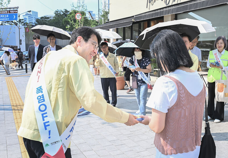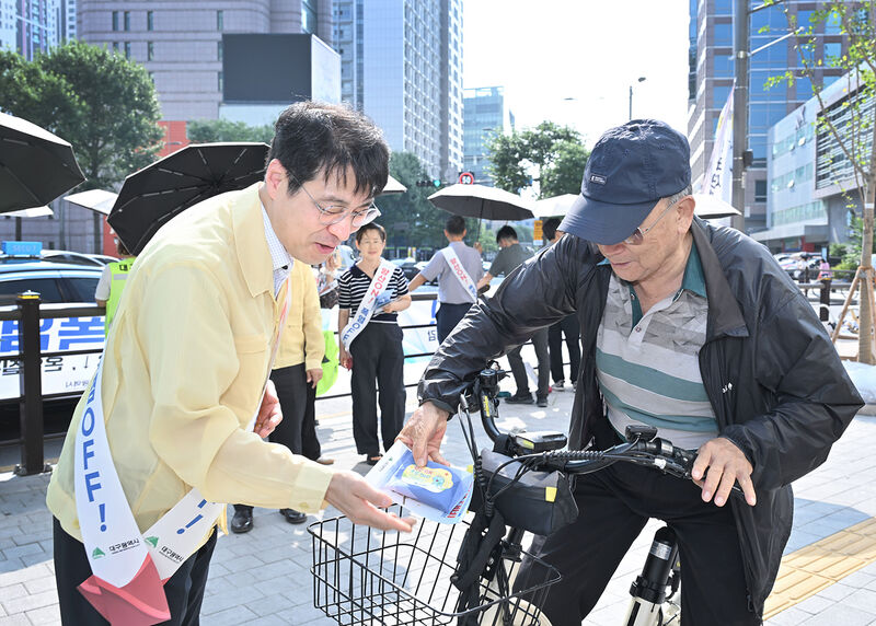 김정기 대구광역시장 권한대행 행정부시장은 7월 8일(화) 중구 공평네거리에서 안전생활실천시민연합(안실련) 등과 함께 출근 시민들을 대상으로 폭염을 슬기롭게 이겨내기 위한 ‘양산 쓰기 캠페인’을 벌였다.
