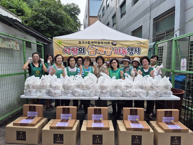 서울 성북구(구청장 이승로) 월곡2동 새마을부녀회(회장 이화정)가 7월 7일 월곡2동 주민센터 1층 뒤뜰에서 ‘사랑의 삼계탕 나눔 행사’를 열고, 관내 저소득 홀몸 어르신 50세대에 삼계탕을 전달했다.