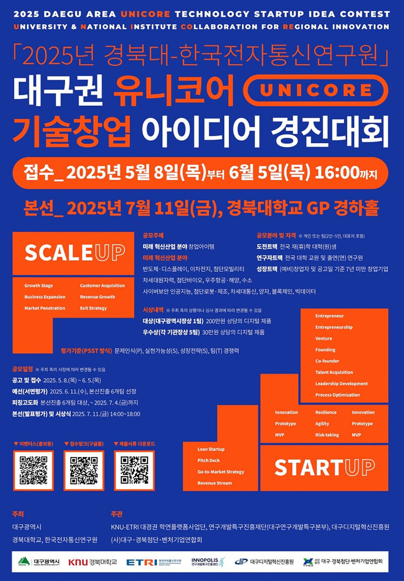 대구광역시는 오는 7월 11일(금), 경북대학교 글로벌플라자(경하 홀)에서 경북대학교, 한국전자통신연구원(ETRI)과 함께 ‘2025년 대구 권 유니코어 기술창업 아이디어 경진대회’를 개최한다.