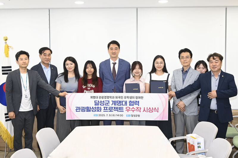 달성군은 지난 9일, 지역 관광지를 체험하고 소개하는 콘텐츠 제작 프로젝트에 참여한 계명대학교 관광경영학과 유학생들을 대상으로 시상식을 열고, 우수작에 상장과 기념품을 전달했다.
