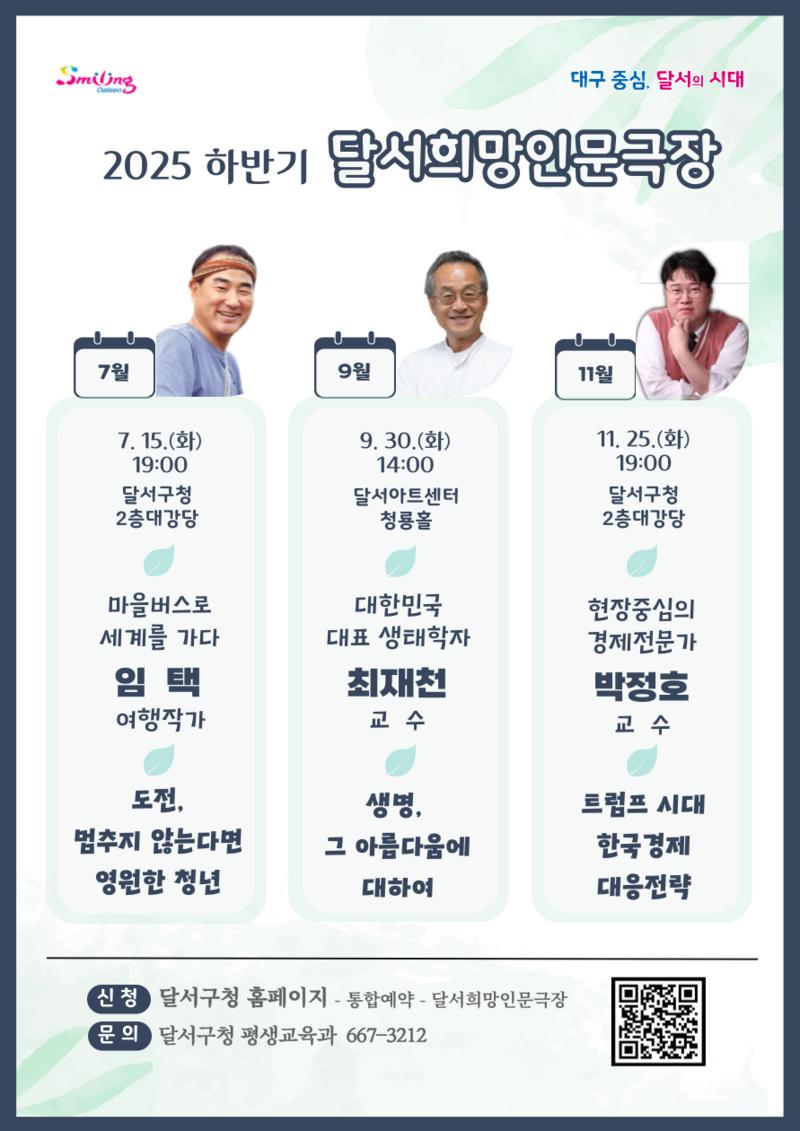 「달서희망인문극장」은 지역 주민의 인문학적 소양을 높이고 삶의 질을 향상하기 위해 매년 이어온 대표 교양 프로그램으로, 올해 하반기에도 각 분야 명사들을 초청해 다채로운 강연을 마련한다.