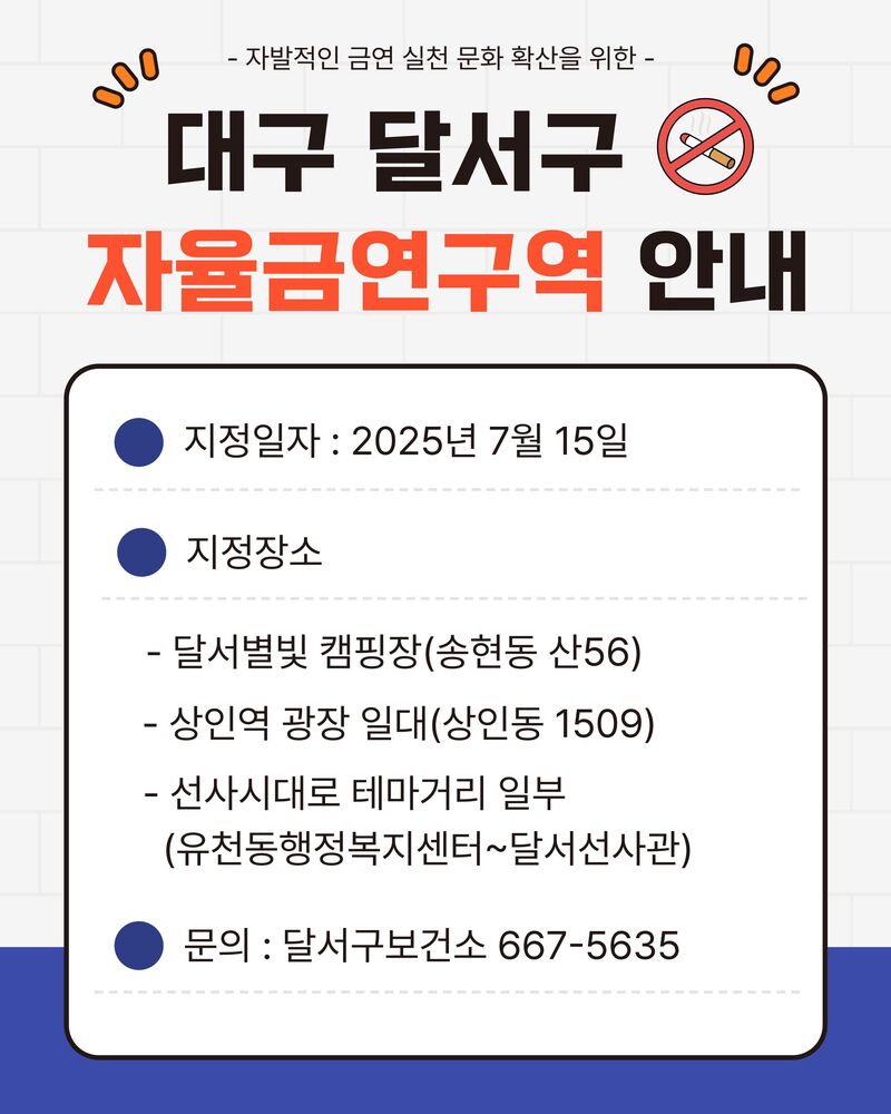 새롭게 지정된 자율금연구역은 ▲달서별빛캠핑장(송현동 산56) ▲상인역 뒤 광장 일대(상인동 1509) ▲선사시대로 테마거리 일부(유천동행정복지센터~달서선사관) 등으로, 특히 가족 단위 방문객과 청소년 이용이 많은 곳을 중심으로 선정해 실효성을 높였다.