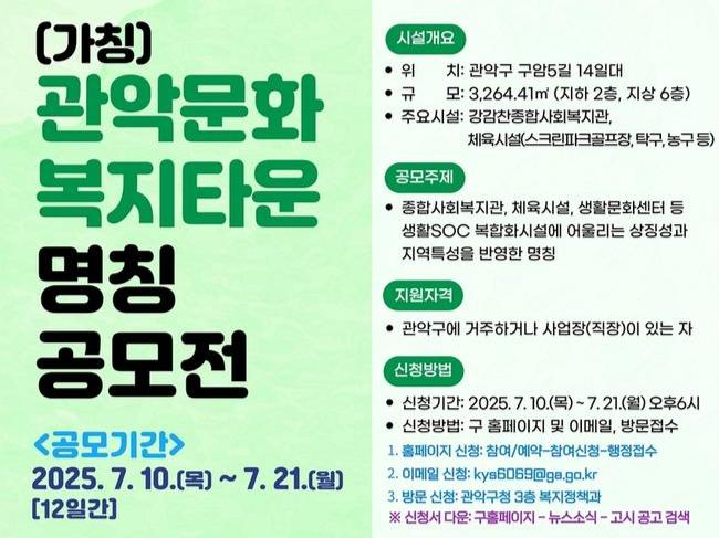 새 명칭 공모는 관악구청 홈페이지(참여/예약▷참여신청▷행정접수)에서 온라인으로 참여할 수 있다. 또는 공모신청서를 작성해 관악구청 복지정책과에 방문해서 접수하거나 담당자 이메일(kys6069@ga.go.kr)로 제출하면 된다.