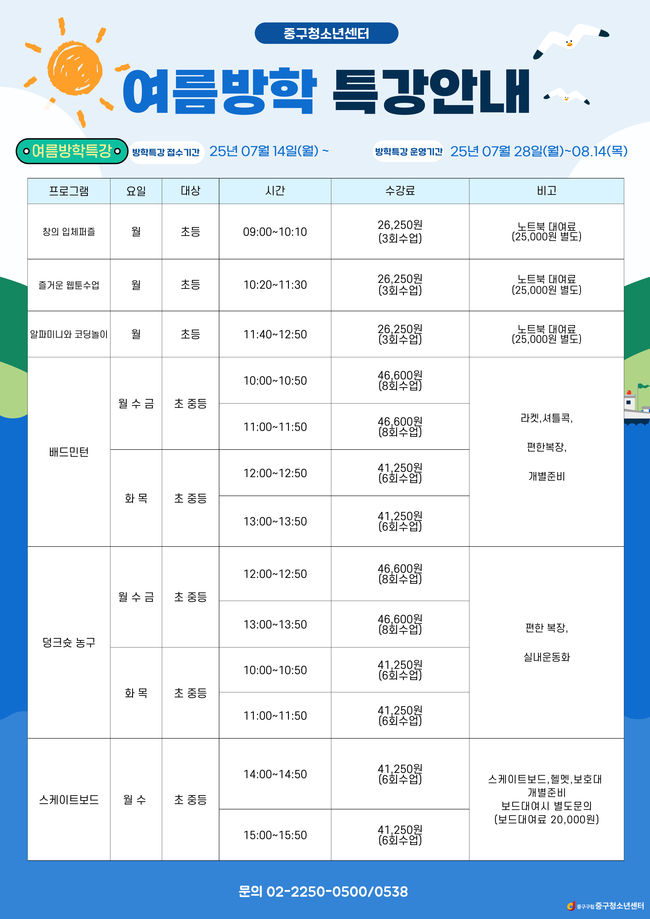 신청은 7월 14일부터 중구청소년센터 홈페이지 내 ‘인터넷접수’ 메뉴를 통해 선착순으로 진행된다. 각 강좌는 소정의 수강료가 있으며, 보다 자세한 사항은 홈페이지 안내를 통해 확인할 수 있다.