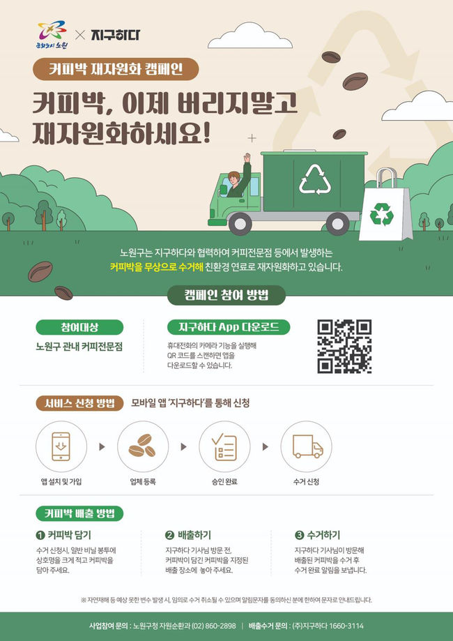 노원구, 버려지는 ‘커피박’ 자원으로 재활용…탄소중립 실현 박차 - 매립 시 발생하는 메탄 줄이고 바이오 연료로 활용 - 커피전문점 대상 ‘지구하다’ 앱 통해 수거 신청 가능 - “자원순환·탄소중립 실현 위한 일상 속 실천 사례”