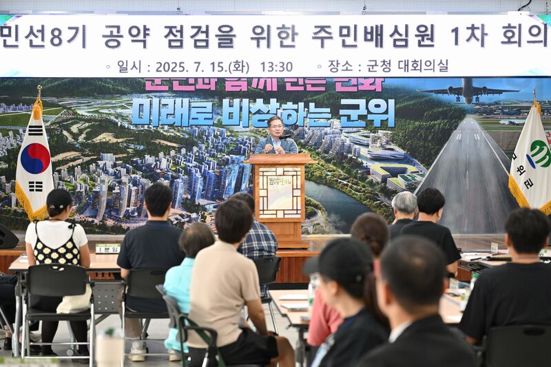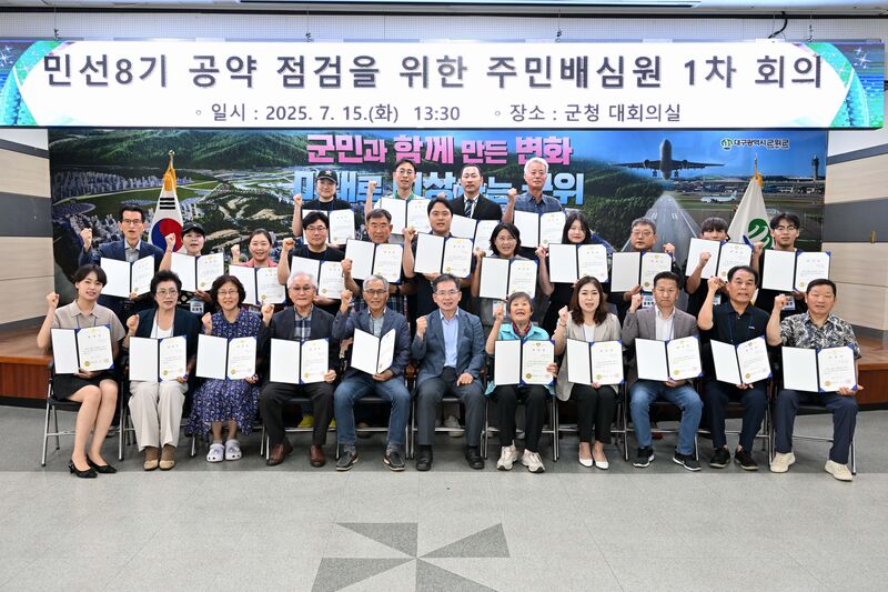 대구광역시 군위군(군수 김진열)은 7월 15일 군청 대회의실에서 ‘민선8기 공약이행현황 점검 주민배심원 1차 회의’를 개최하였다고 밝혔다. 이번 회의는 공약의 체계적 조정과 실질적 평가를 통해 군민과의 약속을 더욱 충실히 이행하기 위한 자리로, 한국매니페스토실천본부와 협력하여 추진되었다.