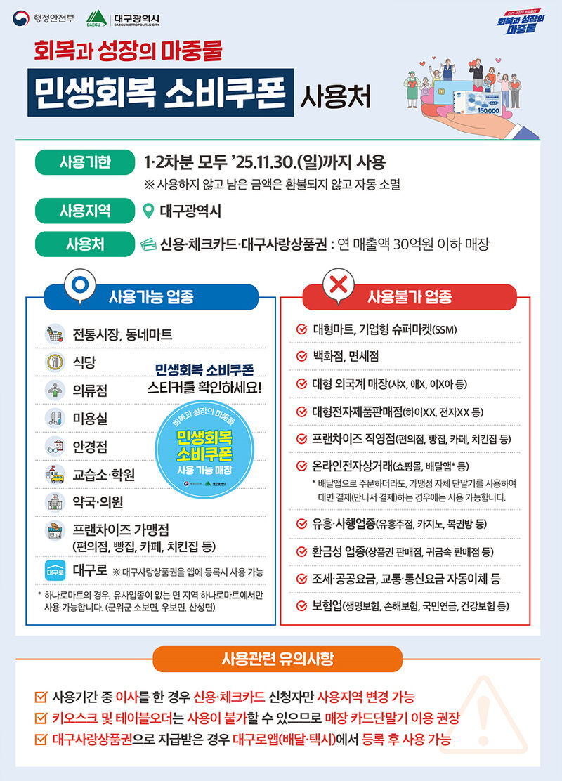 신용·체크카드와 대구사랑상품권 모두 대구광역시 내 연 매출 30억 원 이하 소상공인매장에서 사용 가능하다. 가능한 업종은 전통시장·동네마트·식당·미용실·약국 등이며, 빠른 시일 내 사용가능 매장이 확인될 수 있도록 스티커*를 배부해 부착해 나갈 예정이다.