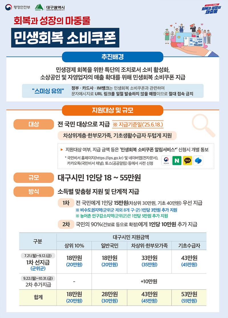 대구광역시 민생회복 소비쿠폰 TF 단장 홍성주 경제부시장은 “이번 민생회복 소비쿠폰을 통해 대구 시민들의 가계 부담도 덜고 지역상권에 즉각적인 활력을 되찾는 경제 선순환 구조가 형성되기를 기대한다”며, “시민이 신청 단계부터 지급·사용까지 불편함이 없도록 만반의 준비를 다하겠다”고 밝혔다.