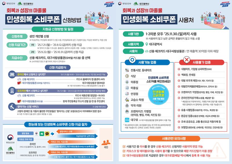 모든 소비쿠폰은 대구시 내 대형마트, 백화점 등 일부 업종을 제외한 연 매출 30억 원 이하의 소상공인 매장에서만 사용할 수 있다.