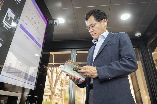 스마트도서관 기기에서 도서를 대출하고 있는 이기재 양천구청장