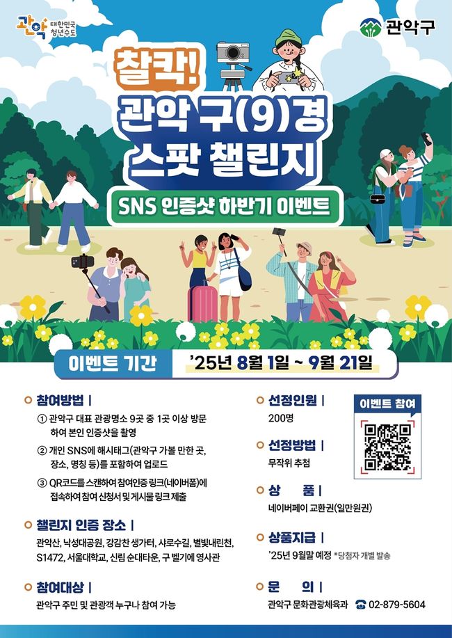 관악구가 대표 관광명소 9곳을 알리고 주민과 관광객에게 즐거운 경험을 제공하고자 하반기에도 ‘찰칵! 관악 구(9)경 스팟 챌린지’ SNS 인증샷 이벤트를 개최한다.